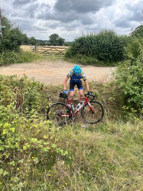 Groups faced by such crises, especially those occurring tantalisingly close to tea and cake, are in need of strong and  decisive leadership. In the absence of this, it is good to have Alex on board. Calling on his encyclopedic knowledge of the lanes and byways of Hertfordshire (and beyond) he pointed out a farm track to our left that would take us on our way. There was, though, the small matter of a deep, sheer-sided ditch between us and our escape route. My leadership skills surfaced at this point. Surely the captain should be the last to leave? So, I waited until the others had crossed unscathed before having a go myself. It occurred to me that if I placed my bike in the ditch it would be a useful prop with which to steady myself on the descent. This might have worked well had not my left foot been lassooed by a bramble. I think it was at this point that Brian helpfully took a photograph.