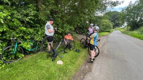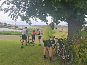 All fed and watered, we departed, with only 22 miles between us and fish and chips by the seaside (well, estuary). Then disaster at 40 miles as Leigh’s back tyre punctured. Leigh turned the bike over and could not unscrew the through axle. We tried and tried. Then with one almighty push, crack, Leigh undid it. He then endeavoured to get the tyre off, but was so tired from trying to get the through axle off. He was getting more and more frustrated and I could see he was ready to “self implode”. Stepping in, we got the tyre off and a new tube in. CO2 injection all done, and then wheel back on, we were up and running.