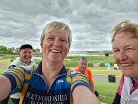 Having climbed more than 2,500 feet already and tummies overfilled we set off back. Next stop was only another 17 miles away in Great Waltham. We sped along up lots of rolling hills. The temperature was dropping rapidly and arm warmers and gilets were back on. Carolyn was to phone Pete when we got to the next stop as he was to going to join us there. We got to the pub at a quarter to four, battered and bruised from all the hill climbing, where a pint of lemonade and lime went down well.